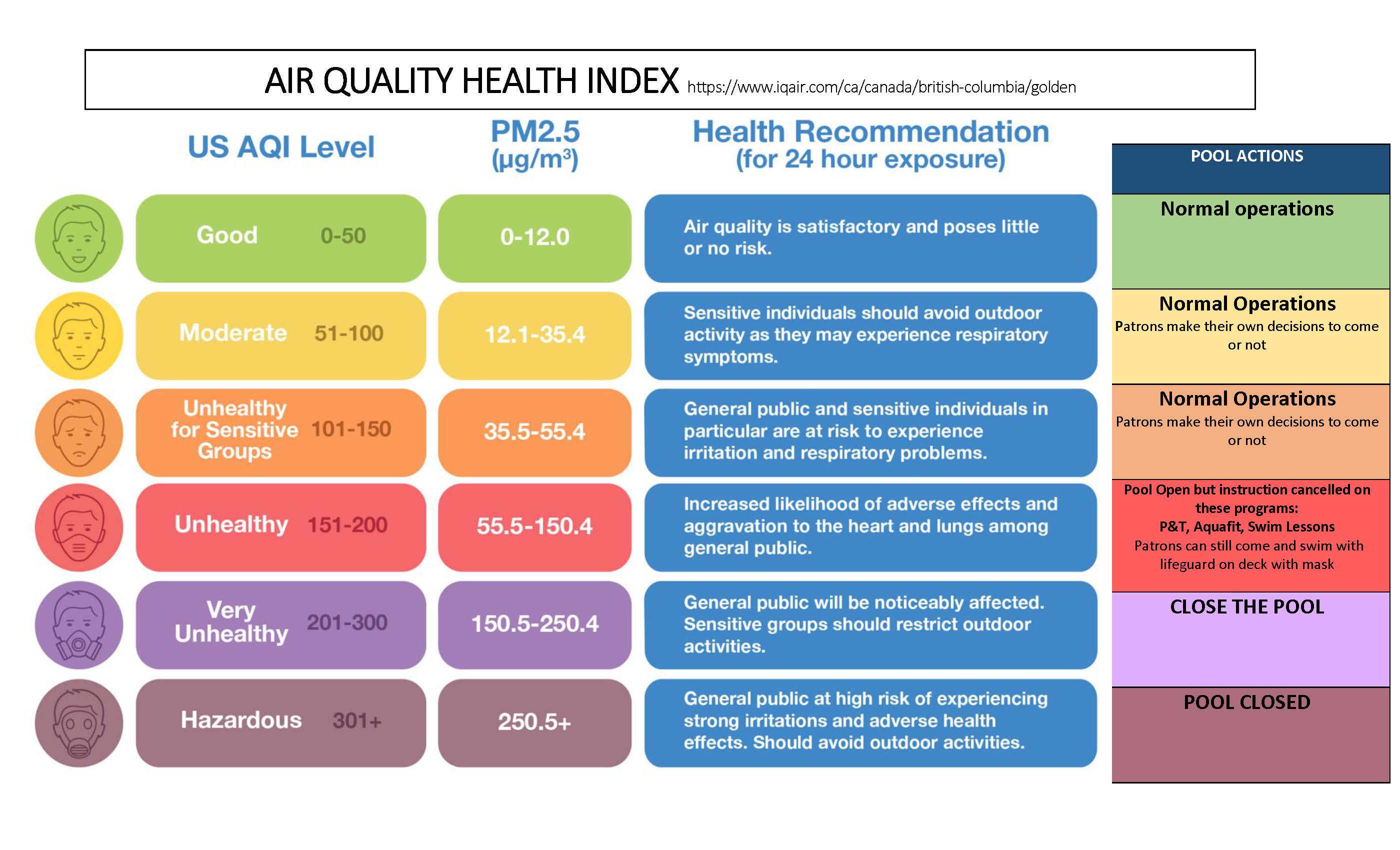 When AQI levels are between 151-200 the pool is open for people to swim, but no instruction is given for Parent & Tot Swim, Aquafit and/or Swim Lessons.