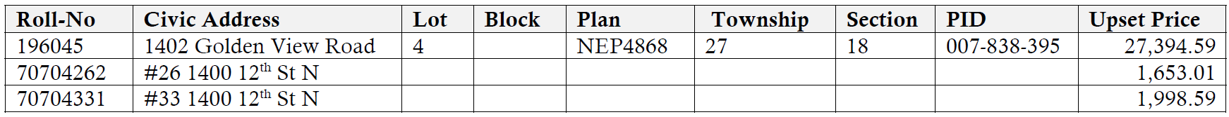The properties listed below will be sold by TAX SALE on September 25, 2023, commencing at 10:00 a.m. in the Council Chambers of Town Hall located at 810 – 9th Avenue South unless the delinquent taxes plus interest are paid at that time. Any person upon being declared the successful bidder must immediately pay by cash debit card, money order, or certified cheque a minimum of not less than the upset price.